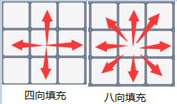 常见的填充方法有四向填充与八向填充,这两种填充方法区别如下图所示: